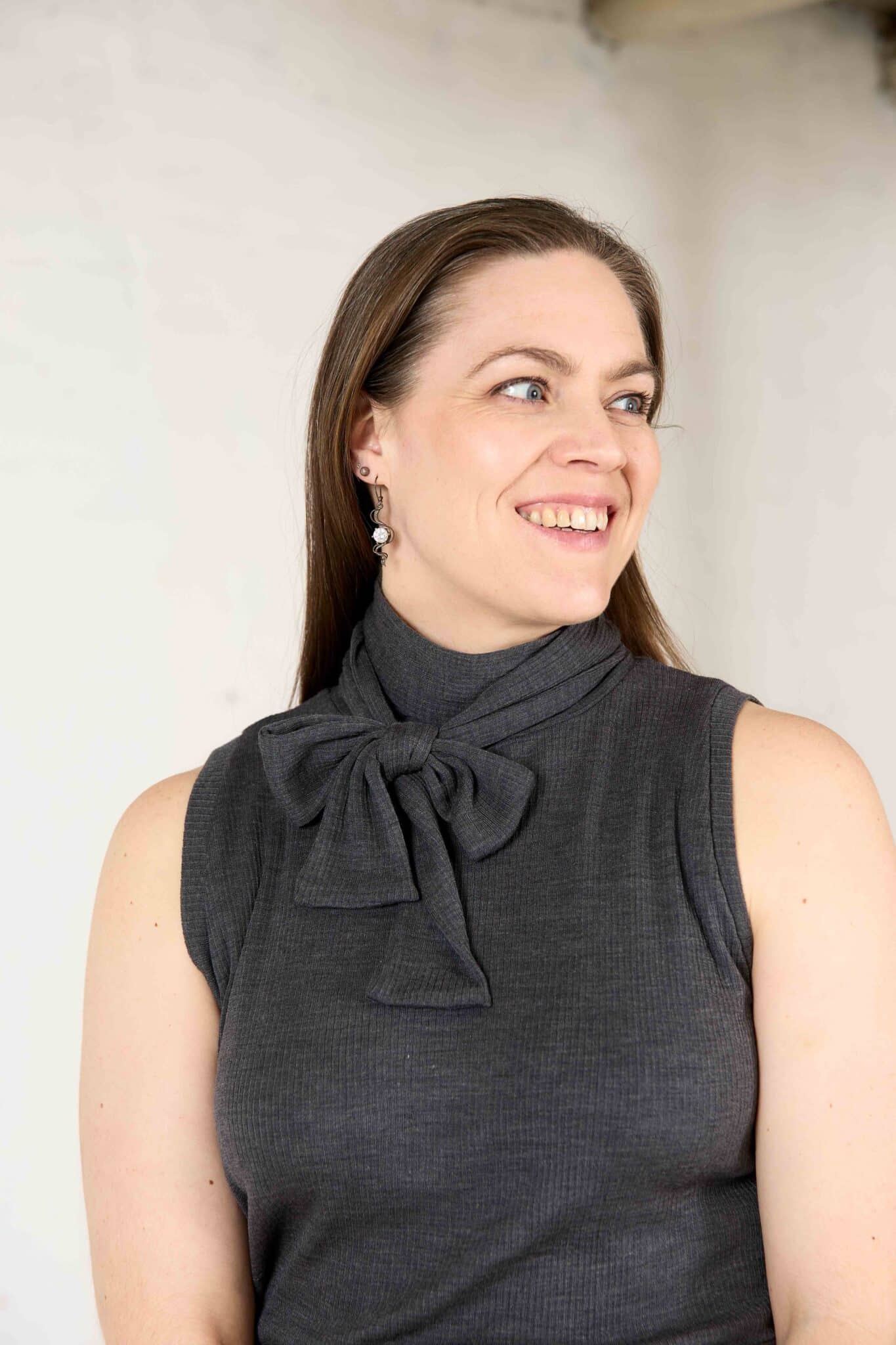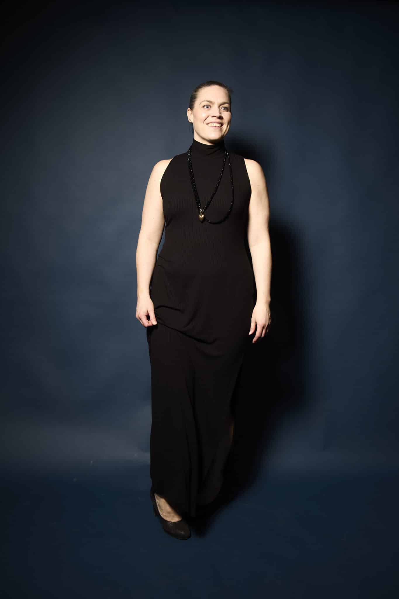 Halskanten i Viktoria kjole er en høj krave, der får lov at drapere, mens den i Signe top er en lavere krave med lange bindebånd, der vikles rundt om halsen og bindes i en sløjfe eller et par knuder. Men i min sorte kjole har jeg valgt en tredje version: en lav krave, der ikke draperer. Vejledningen er taget fra Karen kjole i bogen, men jeg har lavet min version af kraven lidt højere. Hvor høj en krave, man har lyst til at have i sit tøj, er meget individuelt – ligesom med højden af slidsen. Det er vigtigt, at du får lavet et symønster, der giver dig en følelse af komfort. Hvis du hele dagen igennem irriterer dig over en stram eller høj krave, så får du ikke brugt din kjole helt så ofte, som hvis du føler dig tilpas i den. Derfor er det vigtigt at du lytter til din krop, og tilpasser dine symønstre efter hvad den fortæller dig. Føler du, at du bliver kvalt i en høj krave, så lav den lidt kortere, uanset hvad der var den oprindelige plan med designet.
