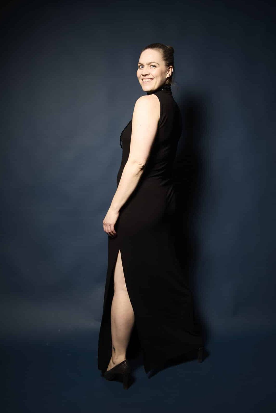 Mønsteret til kroppen i kjolen er lavet efter vejledningen til den første kjole i bogen. Den hedder Viktoria kjole, og er en gulvlang kjole med en høj slids i den ene side. Silhuetten er lige, så uden slidsen er det besværligt at gå i kjolen. Men slidsen kan være kortere, hvis du ikke vil have din kjole helt så åben ved benet. Vil du have en kortere slids, skal du ganske enkelt bare sy sidesømmen længere ned mod bunden, før du hæfter. Er du i tvivl, kan du starte med at sy kjolen med en høj slids, og så gradvist sy sidesømmen længere ned, indtil du finder den længde på slidsen, der både giver dig plads til at gå og føles tryg at have på. Det er ikke alle, der har lyst til at vise ben, og det er helt ok.