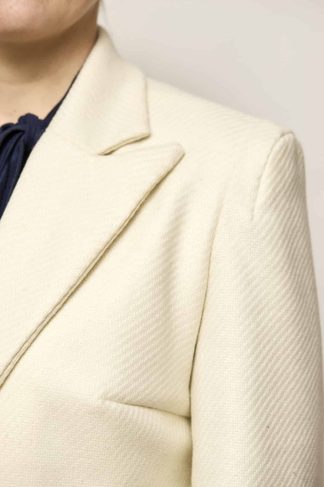 Videoen herover er en af de mange syteknik videoer, der ligger i onlineklubben Synoter Studio. Der er mere end 300 videoer i de onlinebiblioteker, medlemmerne har adgang til. Derudover udkommer der hver eneste måned et onlinekursus i medlemsklubben med et nyt, originalt design, du lærer at lave mønster til og sy fra start til slut. Et af onlinekurserne i Synoter Studio er Leia jakke, som er den hvide blazerjakke på billederne. I onlinekurset kan du også se hvordan du trin for trin vender et spist hjørne, hvor sømrummet bliver klippet ned.