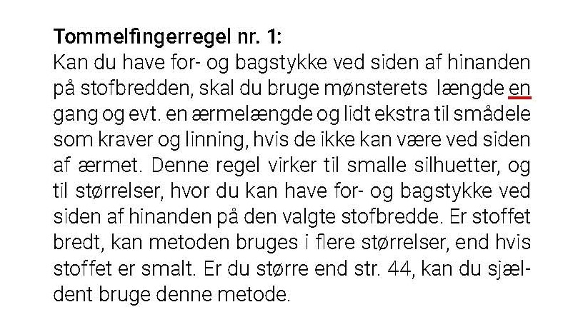 Kan du have for- og bagstykke ved siden af hinanden på stofbredden, skal du bruge mønsterets længde en gang og evt. en ærmelængde og lidt ekstra til smådele som kraver og linning, hvis de ikke kan være ved siden af ærmet. Denne regel virker til smalle silhuetter, og til størrelser, hvor du kan have for- og bagstykke ved siden af hinanden på den valgte stofbredde. Er stoffet bredt, kan metoden bruges i flere størrelser, end hvis stoffet er smalt. Er du større end str. 44, kan du sjældent bruge denne metode.