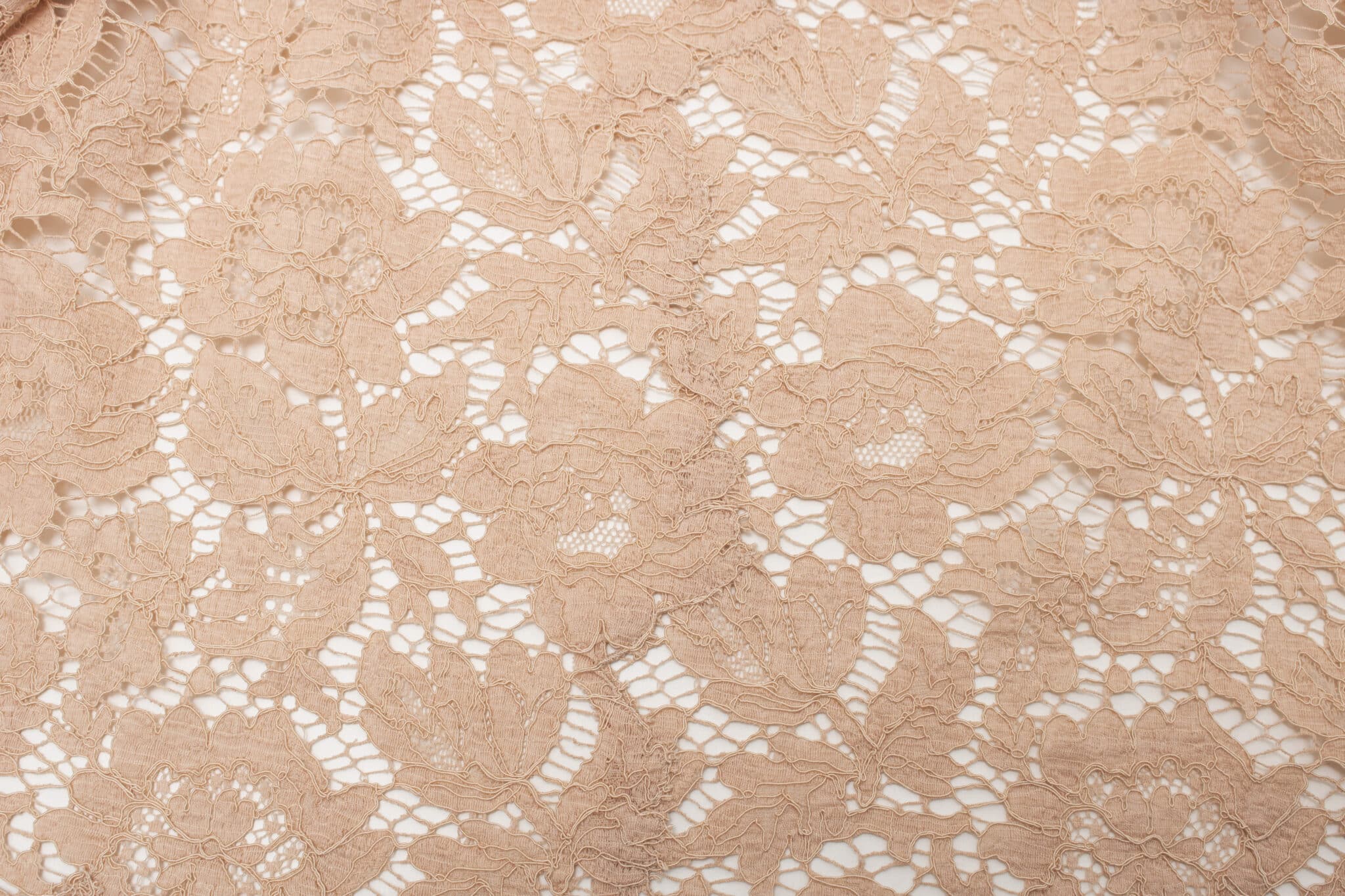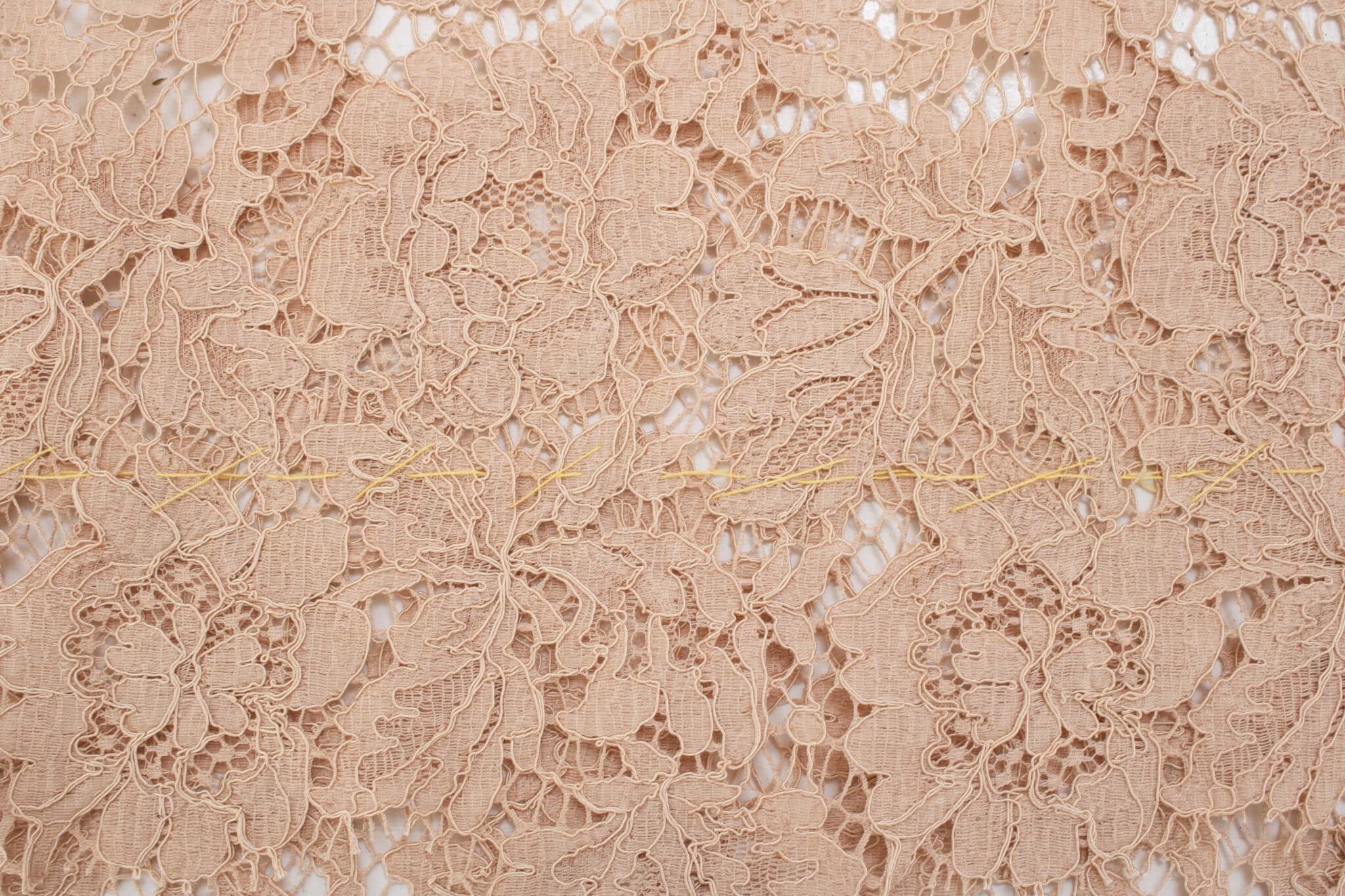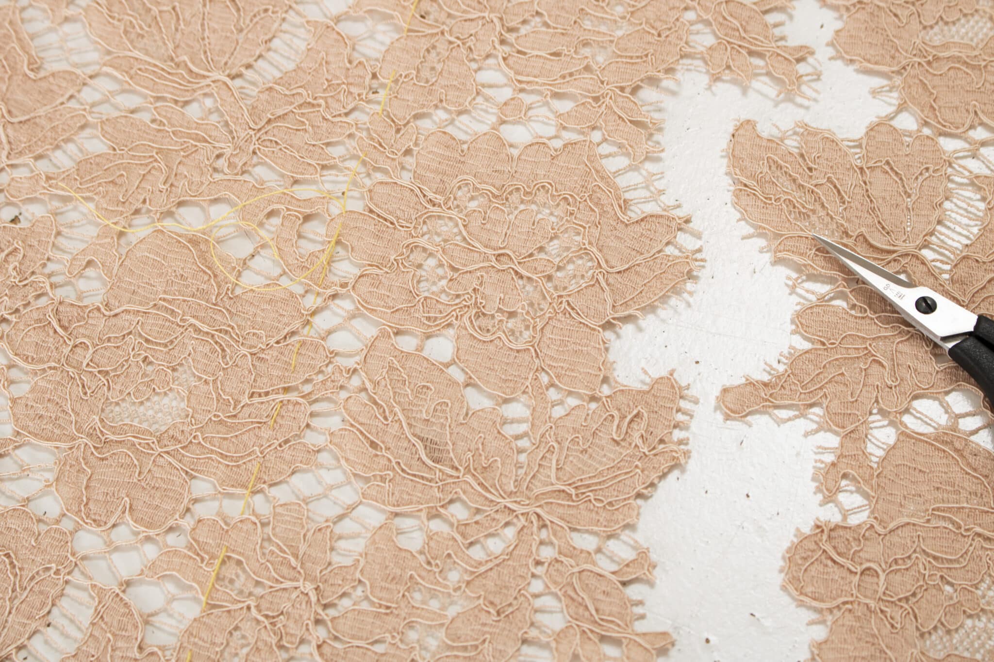 Når sylinjerne fra mønsteret er overført til blonden, klipper du dem ud lidt råt. Klip stoffet langs blondens mønster et stykke fra sylinjen, så der er et bredt sømrum hele vejen rundt. Sømrummet skal ikke nødvendigvis være lige, men kan følge mønsteret i blonden, hvis der er et tydeligt mønster som blomsterne i denne blonde. Hvor meget ekstra sømrum, du har brug for, kommer helt an på hvilket mønster der er i blonden. Følg det så godt du kan, og sørg for at have mindst 2 cm sømrum, men gerne mere.