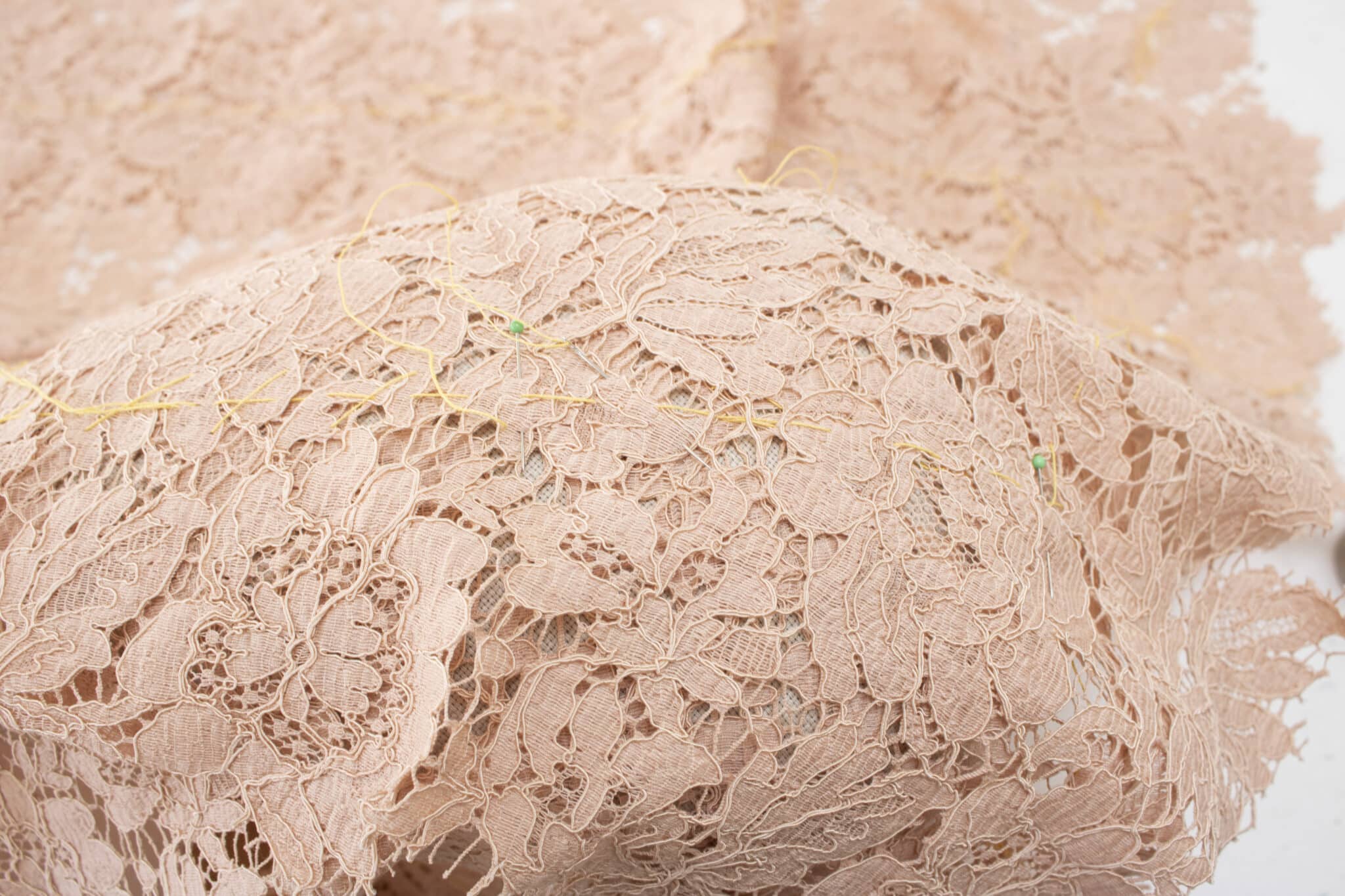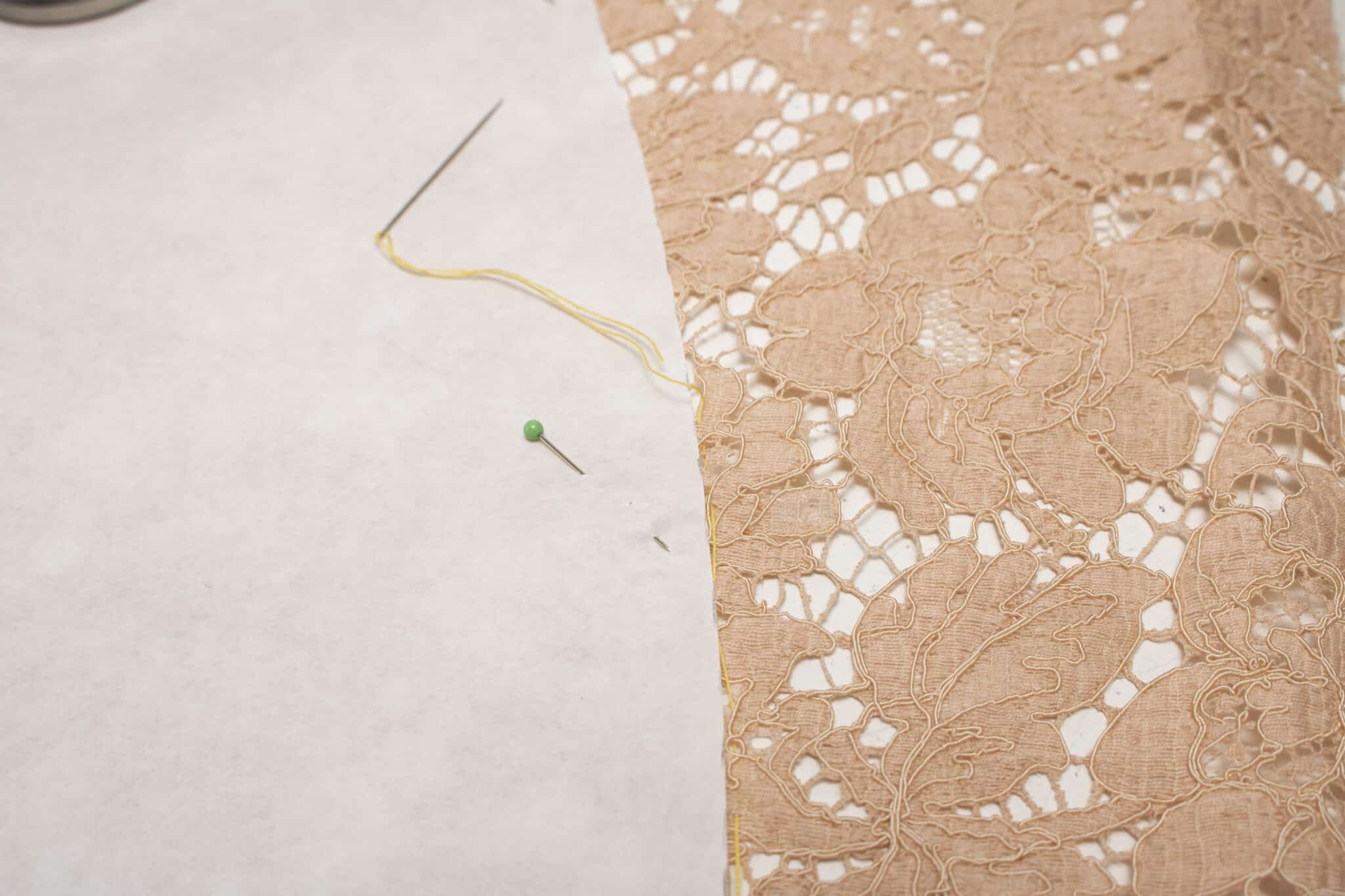 Læg mønsterdelene oven på hinanden i sømmene, så begge stoflag ligger med retsiden opad og sylinjerne ligger præcis oven i hinanden. Blondens ekstra sømrum lapper ind over på hver side af sylinjen, som er den riede (eller tegnede) linje i begge stoflag. Sæt knappenåle på tværs af sylinjen, så du holder stoflagene samlet. Brug knappenåle med glashoved, så de er nemme at få øje på og ikke ryger helt gennem blonden.