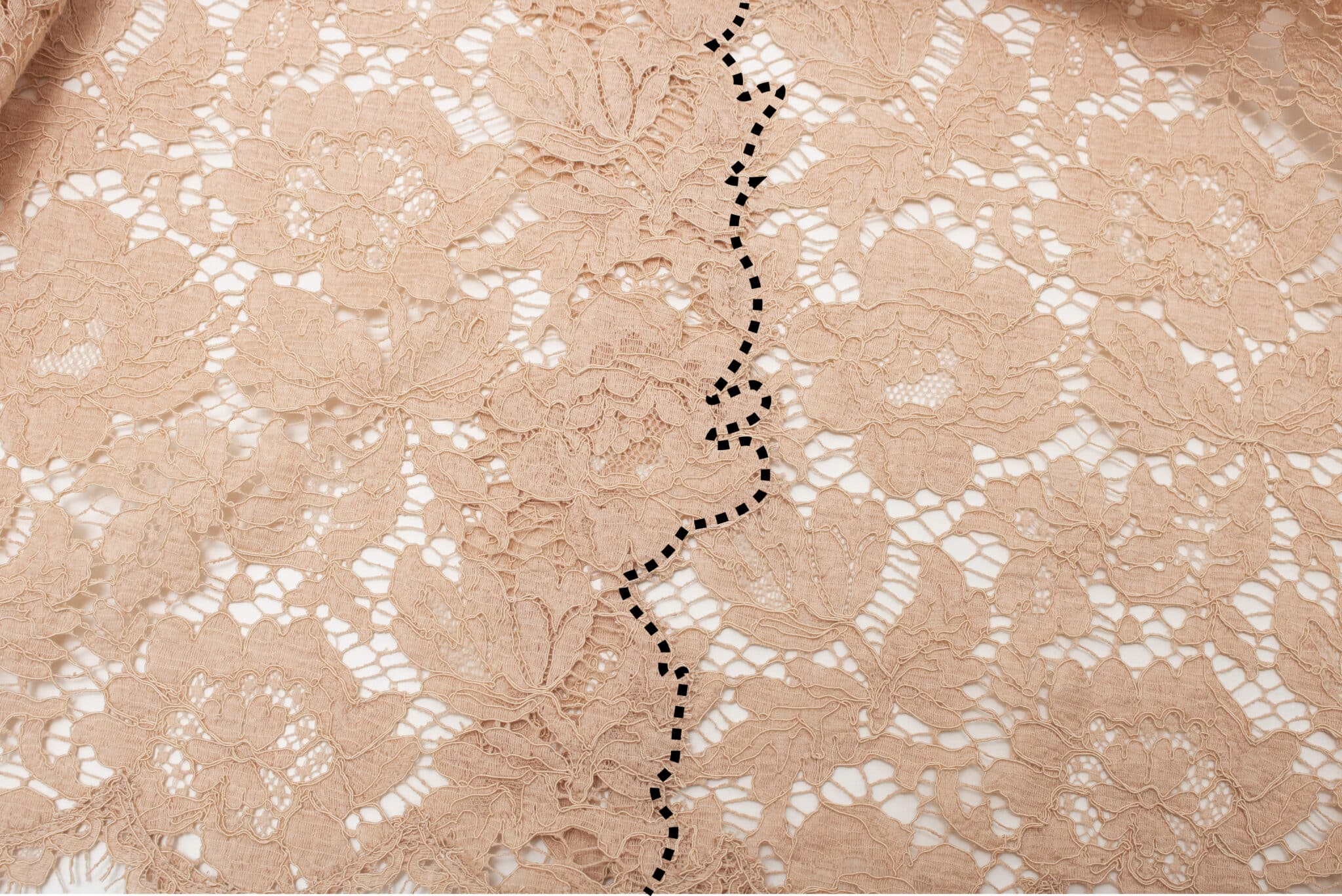 Det er ikke vigtigt præcis hvor du syr i forhold til sylinjen, da mønsterdelene passer sammen som de skal. Så det ændrer ikke noget ved pasformen og størrelsen af det færdige tøj, hvis du syr primært på den ene side af den riede sylinje, eller hvis du krydser over den flere gange. Se derfor efter mønsteret i blonden. Jo mere du kan følge mønsteret, jo mere usynlig bliver den færdige søm. Se den tegnede sylinje med sort på det billede nr. 2 herunder.