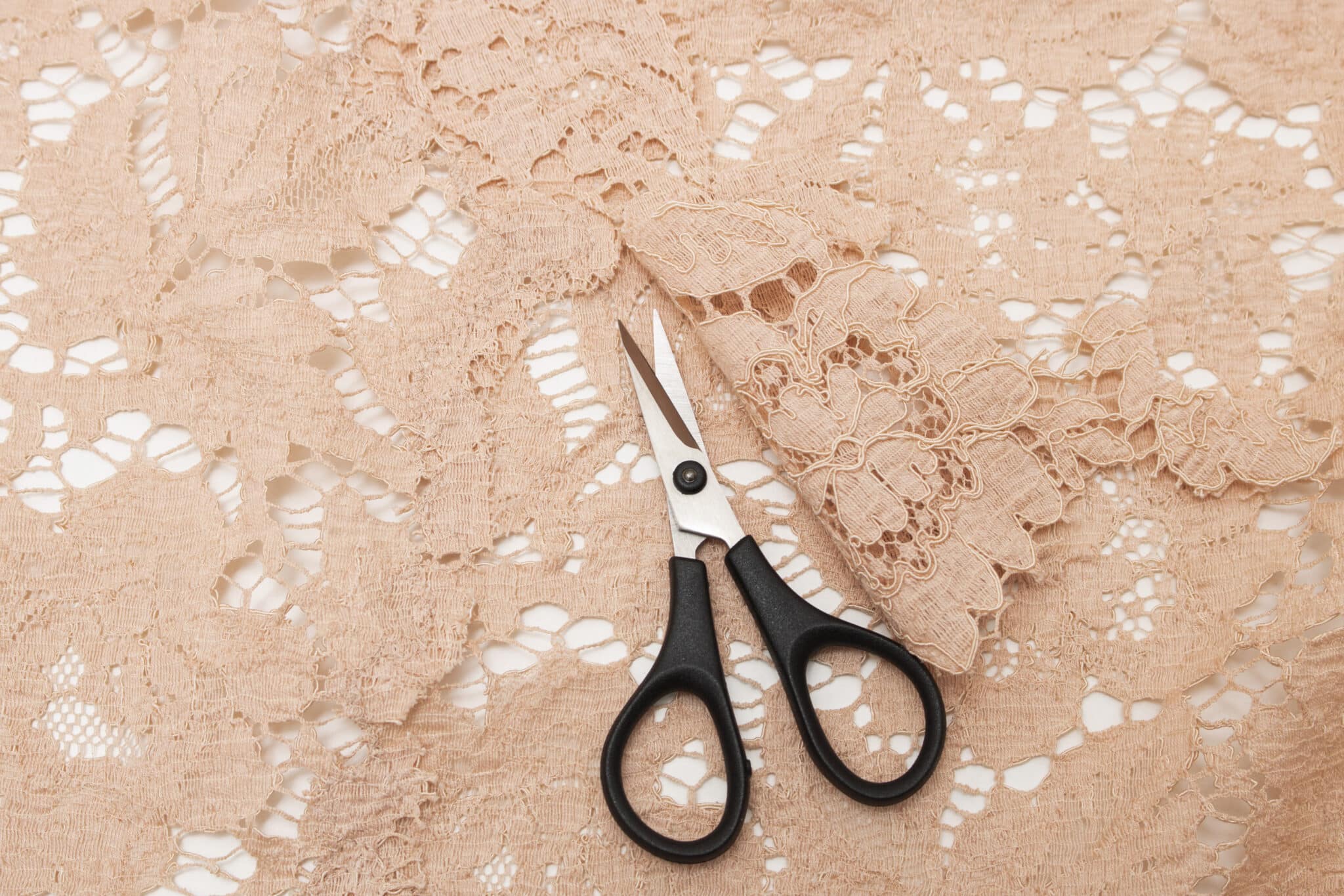Når sømmene er syet, er der et overskud af blonde enten på den ene eller begge sider af den syede søm. Klip det overskydende blonde af, så der er ca. 0,5 cm sømrum på bagsiden af stoffet. På retsiden skal du vurdere blonden og synligeheden af sømmen, før du afgør hvor meget sømrum der evt. skal være. Klip sømrummet så smalt som muligt, så det bliver mest usynligt, men vær samtidig opmærksom på at sømmen skal kunne holde til brug og ikke skal trævle op af sig selv. Blonde trævler som udgangspunkt ikke, men nogle blonder kan alligevel være så sarte, at de har brug for lidt ekstra sømrum. Brug en god saks til at klippe sømrummet af blonden, så det bliver en ensartet kant uden hak. Du kan evt. bruge en applikationssaks, som gør det nemmere at klippe det ene stoflag af uden at skade det stoflag, der ligger under.