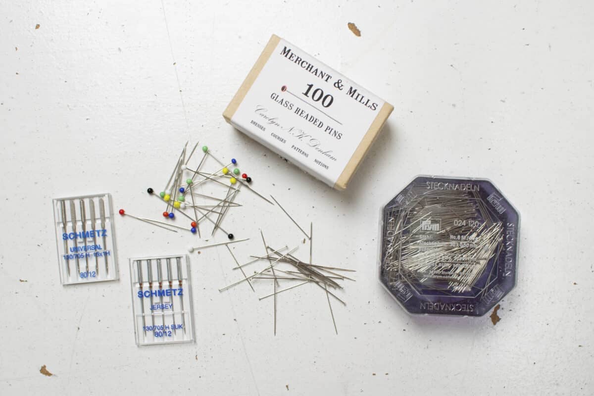 Køb knappenåle i god kvalitet, så de ikke ødelægger dit stof. Knappenåle skal være spidse og glatte, ellers risikerer du, at de trækker tråde ud af stoffet og laver permanente huller. Jeg er selv glad for knappenåle fra Merchant & Mills og Prym. De skal ikke være for tykke – gå efter 0,3 eller 0,4 mm i tykkelse. Længden på knappenåle varierer en del. Jeg kan godt lide dem korte (ca. 3 cm), mens andre foretrækker dem længere. Prøv lidt forskelligt, til du finder din favorit.