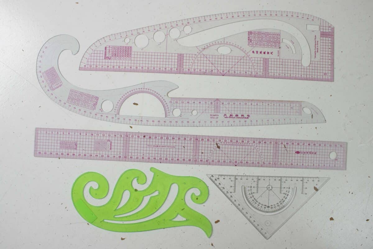 Til mønsterkonstruktion anbefaler jeg en patternmaker lineal, som er den lineal, jeg selv bruger. I patternmaker linealen har du både en lang lineal, en vinkelmåler og en kurvelineal samlet i samme lineal. Alternativt kan du have en lang lineal, en vinkelmåler og en kurvelineal som tre forskellige linealer. Andre muligheder for linealer er en skrædderlineal eller en quiltelineal. Uanset hvad du vælger, så er det en fordel med en gennemsigtig udgave med centimetermarkeringer et stykke inde på linealen. En vinkelmåler kan du købe i boghandleren eller supermarkedet. Køb en uden gummi på bagsiden, så den glider bedre hen over mønsterpapiret. Kurvelinealer hedder ofte ”franske kurver” og findes i mange udgaver. De kan være en hjælp, hvis du ikke er vant til at tegne kurvede linjer i hånden.