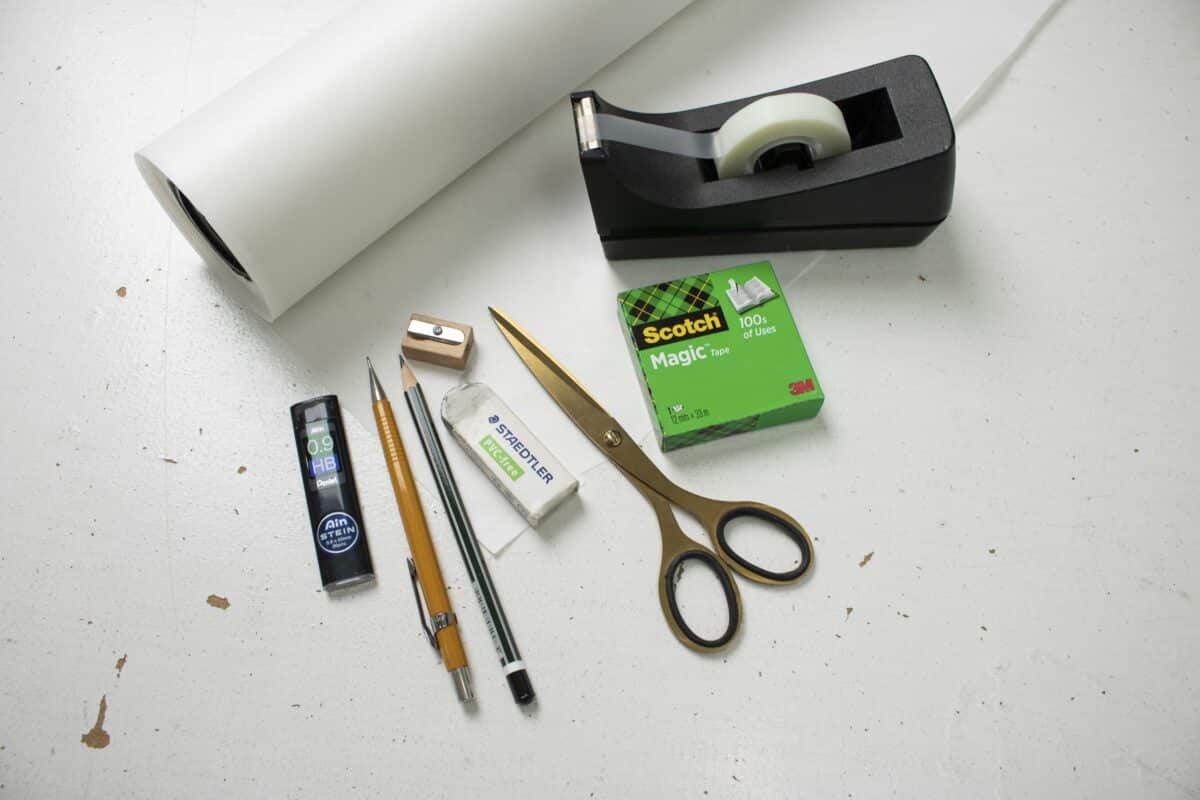 Magic tape er det bedste til mønsterkonstruktion. Du kan tegne på det, og på lidt kraftigere mønsterpapir kan du tage det af igen, hvis du får brug for det. Magic tape findes i forskellige varianter. Jeg foretrækker selv magic tape fra mærket Scotch. Boghandlerne har den som regel i 19 mm, men til mønsterkonstruktion foretrækker jeg 12 mm, som er lidt nemmere at arbejde med. Køb en god, tung holder til din tape, så er det nemmere at få fat i tapen, når du arbejder.