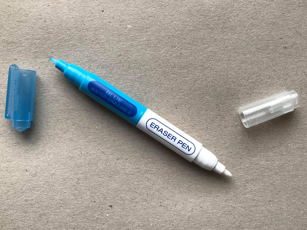 Test om markeringen kan holde til at blive strøget og dampet ved samme temperatur som du vil stryge stoffet med undervejs. Test bagefter om den strøgne markering kan fjernes igen med vand eller den hvide visker, uden at der efterlades mærker. Når vi har testet pennen på syværkstedet, holder pennens blå farve til både varme og damp. Og farven kan nemt fjernes med den hvide visker efter strygning.
