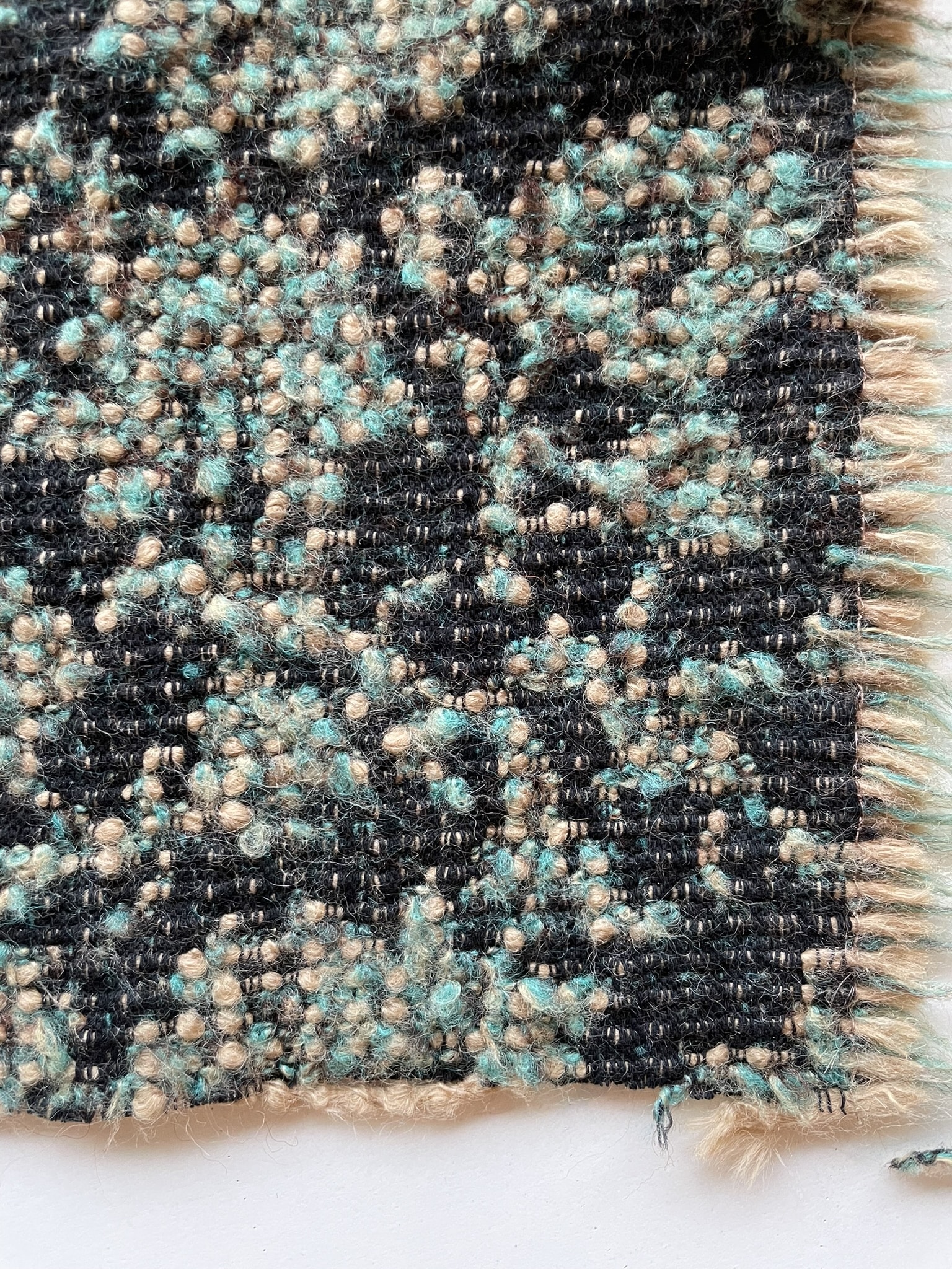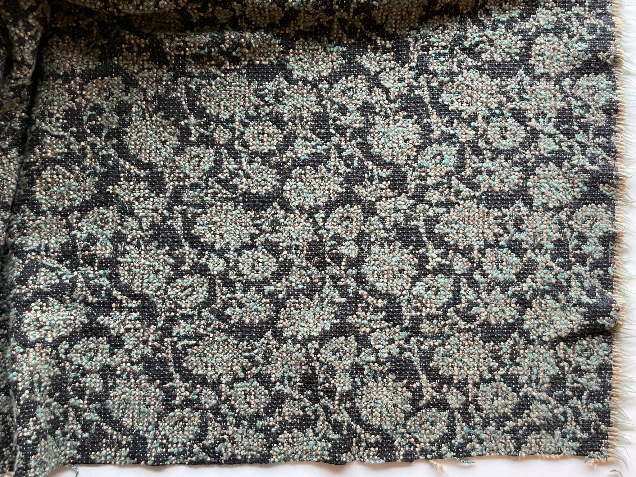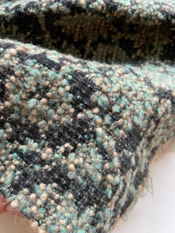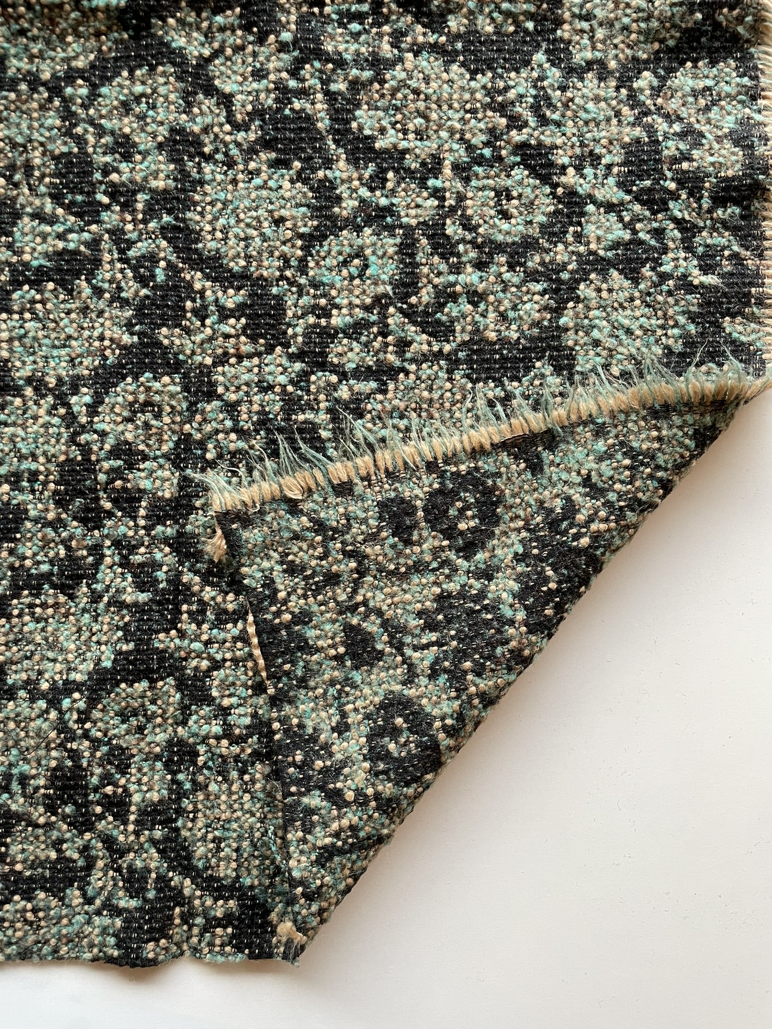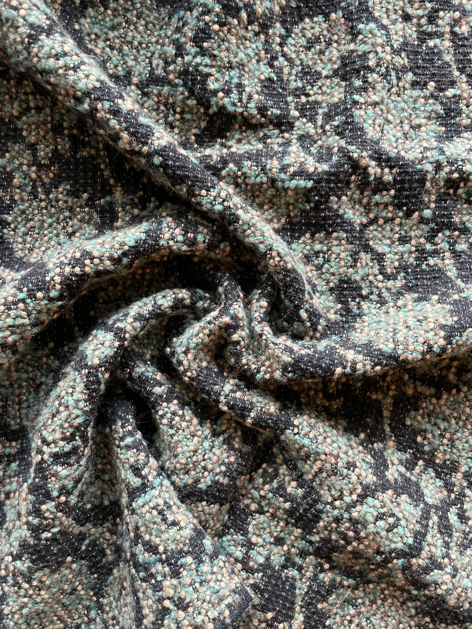 Flot, jacquardvævet bouclé med dybde i overfladen, der kommer af at nogle af garnerne “bobler” op over stoffet. Vævet af flere forskellige garner i forskellige tykkelser og strukturer, der skaber et spændende stykke stof med en lidt ru overflade. Kvaliteten er kraftig, men let. Perfekt til bouléjakker i Chanel-stil, en bomberjakke eller en oversize, kort jakke. Kan også bruges til nederdel eller kjole, men er lidt kraftigt, så vær opmærksom på det, når du designer.