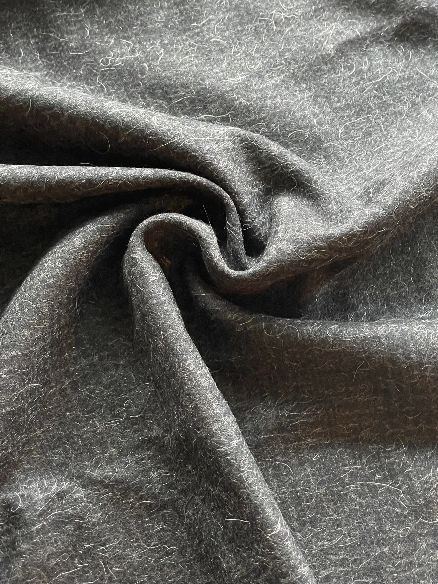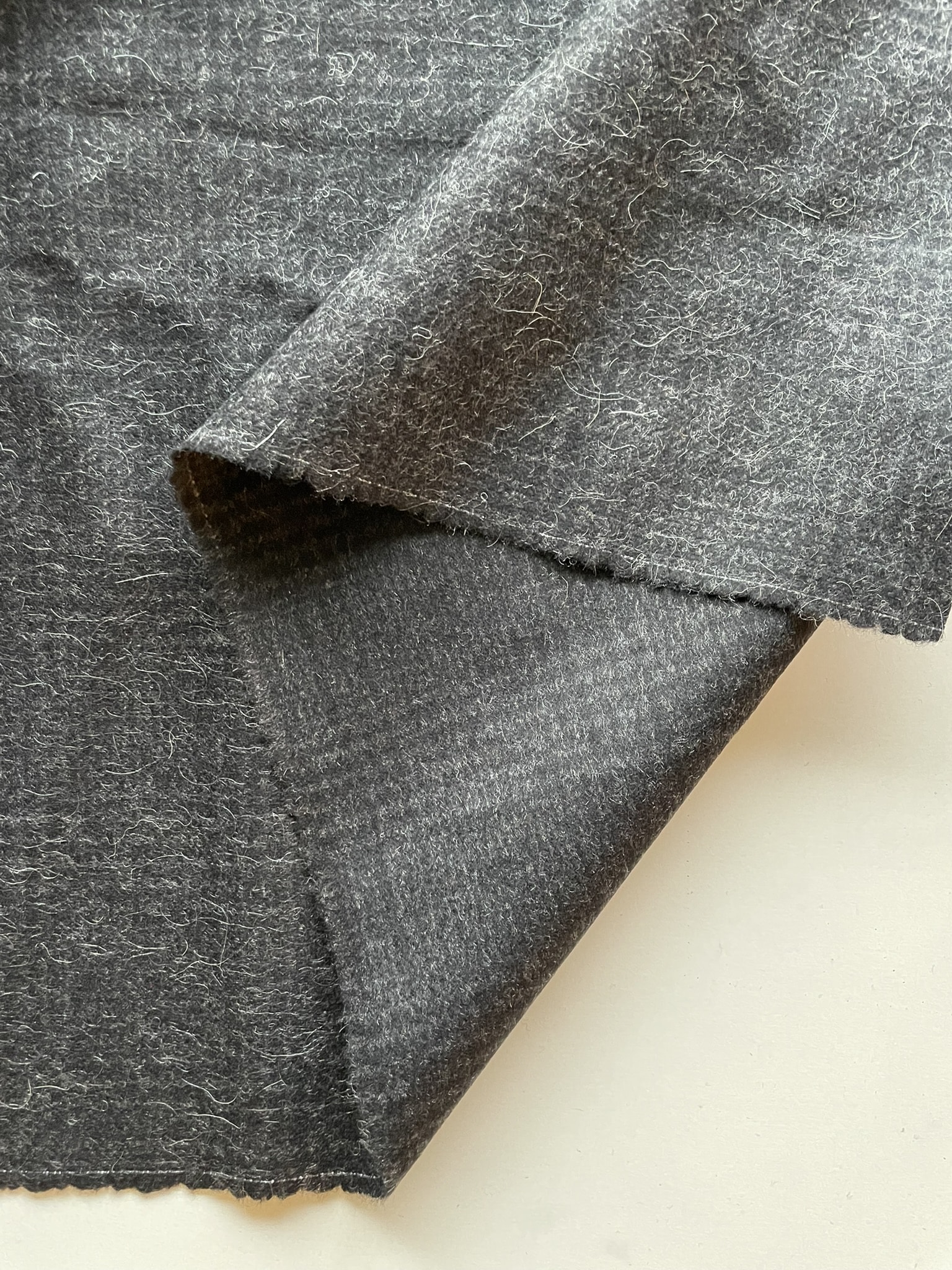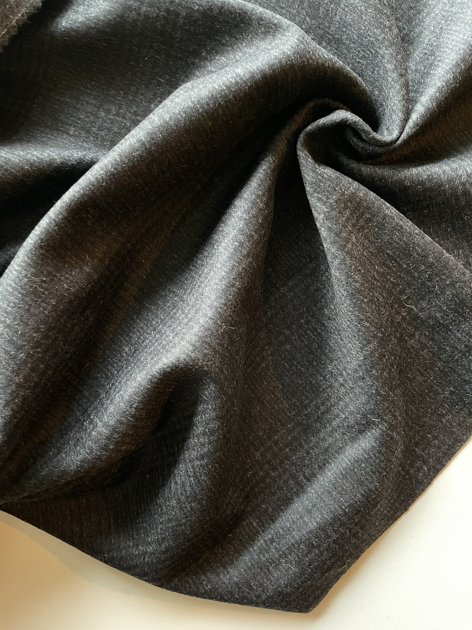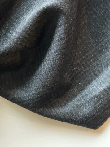 Lækker, tætvævet tweed med en let børstet overflade på retsiden. Vrangsiden har flere “løse” hår, og kan også bruges som yderside, hvis du bedre kan lide det lidt mere “uldne” look. Stoffet er ternet, men er vævet med to meget mørke, grå farver, så det ternede mønster ikke er helt så iøjefaldende på afstand. Perfekt til vinterfrakker og andet overtøj til vinterbrug.
